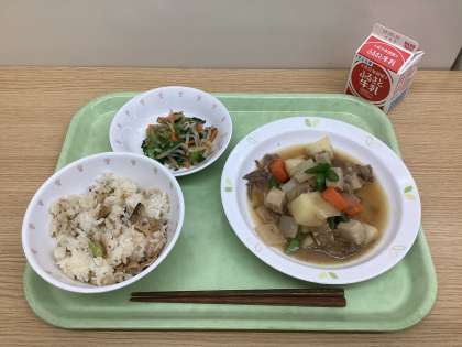 まめまめおこわ 肉じゃがうま煮 ごまあえ 牛乳