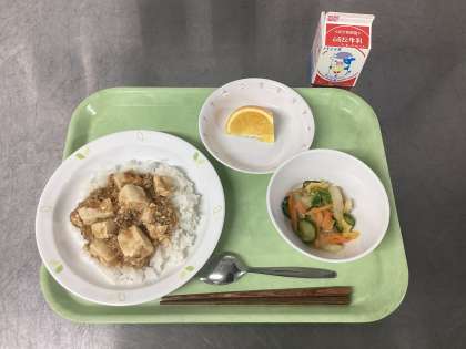 麻婆豆腐丼 白菜の中華サラダ はっさく 牛乳