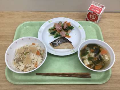 たけのこごはん 魚の西京焼き かまぼこ入り和風サラダ すまし汁 牛乳