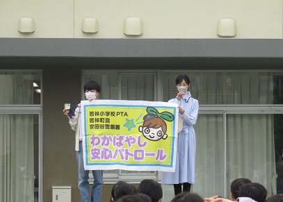 5月1日(月)全校朝会において、PTAの役員の方より、「わかばやし安心パトロール」についてのお話がありました。パトロールのプレートを付けた保護者の方々が子どもたちの安全を見守ってくださっており、子どもたちも真剣にお話を聞いていました。PTAの方々には、様々な場面で子どもたちの安全安心な環境づくりにご協力いただいております。今年度もどうぞよろしくお願いいたします。