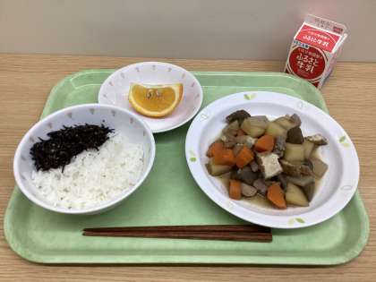 ごはん しそひじきふりかけ 五目うま煮 甘夏みかん 牛乳