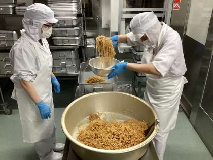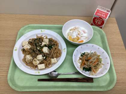 麻婆豆腐焼きそば ナムル フルーツヨーグルト 牛乳