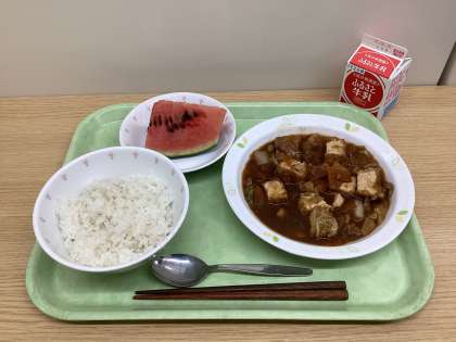 麦ごはん 家常豆腐 スイカ 牛乳