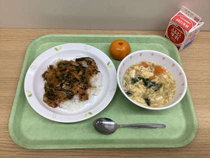 キムチ丼 中華風たまごスープ 冷凍みかん 牛乳