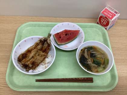 イワシの蒲焼丼 沢煮椀 スイカ 牛乳