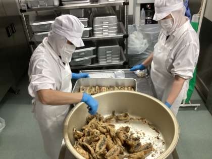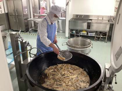 給食では、うなぎの代わりにイワシの蒲焼を作りました。