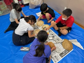 ふくべ細工では、乾かした夕顔の実に絵を描いていきます。子ども達が使っている夕顔の実は、なんと1年前から干して乾かしたものだそうです。