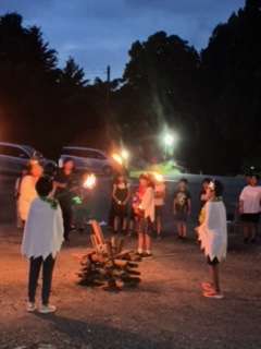 火の神の校長先生から、火の子たちに、厳かに火が分け与えられてキャンプファイヤーの幕開けです。衣装も雰囲気が出ていて、とてもよかったですよ。