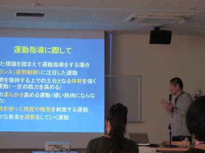 9月4日(月)にすまいるの保護者学習会が開かれました。運動指導を研究されている大学の先生を講師にお招きして、子供と一緒に楽しむ運動をたくさん紹介していただきました。体を動かしながらバランス感覚や体幹を整えていくことで、様々な意欲や自己肯定感も高まっていくとのことです。「運動の秋」楽しんでいきたいです。