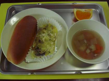 献立名 ミルクパン 牛乳 魚のマヨネーズ焼き 野菜スープ 清美オレンジ