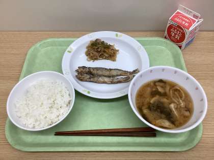 ごはん ししゃもの唐揚げ 切干大根の煮付け じゃがいものみそ汁 牛乳