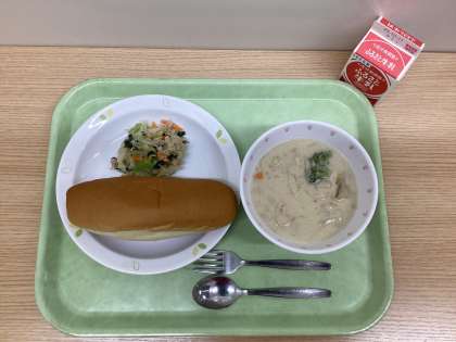 あしたばパン さつまいもシチュー 青菜とツナのサラダ 牛乳