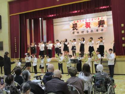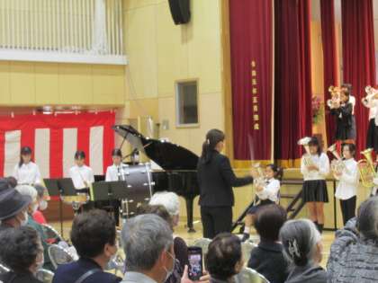 10月15日(日)に町会主催の敬老会があり、本校の金管バンドの児童が出演しました。大勢の地域の方を前に緊張していましたが、練習の成果を披露することができました。来月も地域で発表する機会があります。素敵な演奏、楽しみです。