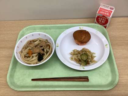 きつねうどん 梅サラダ みそマフィン 牛乳