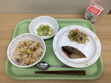 秋の香りごはん 魚の照り焼き おひたし 月見団子 牛乳