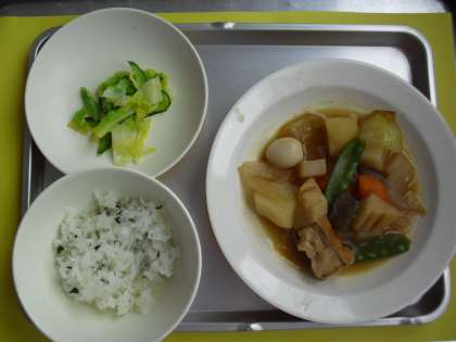 献立名 わかめごはん 牛乳 春野菜のうま煮 ひとしお野菜