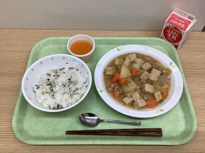 わかめごはん じゃがいものそぼろ煮 キャロットゼリー 牛乳