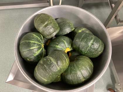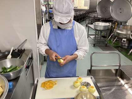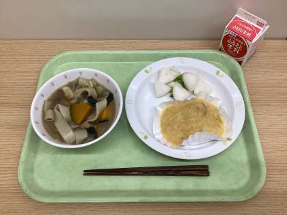 明日は冬至です。今日の給食は一足早く、かぼちゃとゆずを使った冬至献立を作りました。