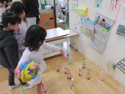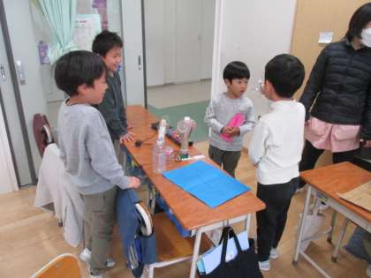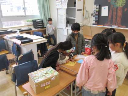 12月19日(火)1年生は併設保育園との交流を行いました。保育園の年長の子どもたちが楽しく学校で遊べるように、優しく接したり、分かりやすく遊びの説明をしたりしていました。自分たちが準備した遊びで年長の子どもたちが楽しく遊んでいて、とても満足の様子でした。