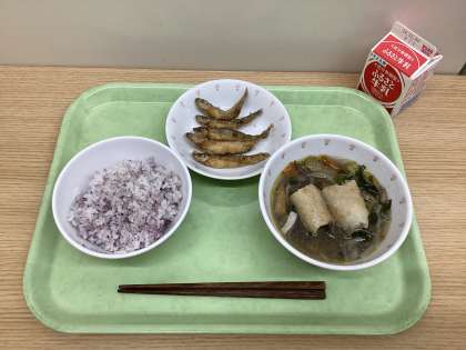 ゆかりごはん わかさぎの唐揚げ きりたんぽ汁 牛乳