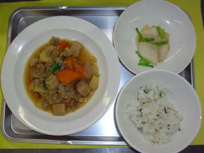 献立名 青菜とじゃこのご飯 牛乳 新じゃがそぼろ煮 かぶのレモンじょうゆかけ