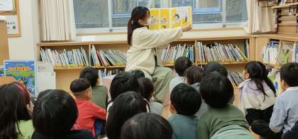 司書による読み聞かせにみんな夢中です。本は心の栄養。たくさん読んでほしいですね。