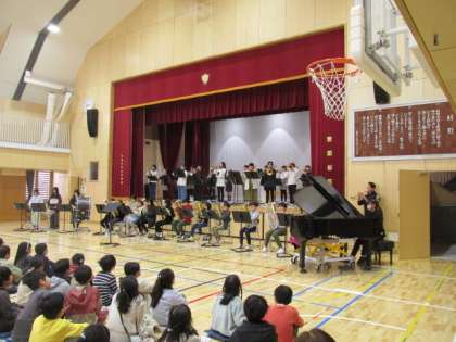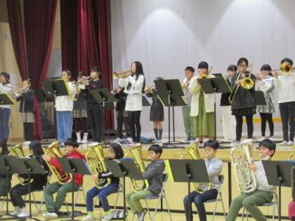 音楽朝会において、金管バンドの演奏を披露しました。今年度、様々な地域行事において演奏を披露してきましたが、全校の前で演奏をするのは初めてです。緊張した様子も見えましたが、どの子も自信をもって演奏していました。来年も、多くの子どもたちが金管バンドに入ってくれるとうれしいです。
