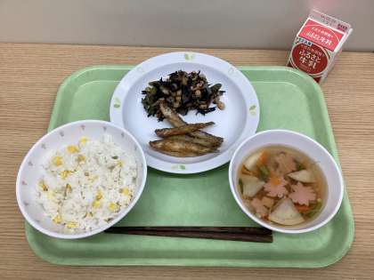 とうもろこしごはん わかさぎの唐揚げ ひじきの煮付け かぶとえのきのスープ 牛乳