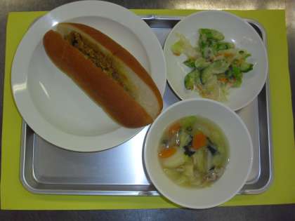 献立名 ドライカレーサンド 牛乳 ベーコンと野菜のスープ アスパラガスのサラダ