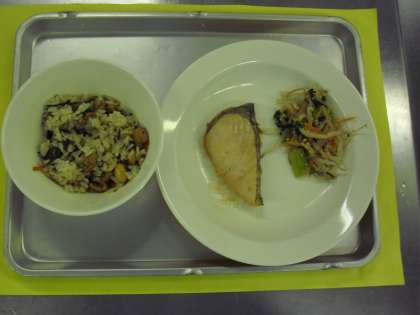献立名 豆入りひじきごはん ぎゅうにゅう 魚の西京焼き 野菜のごまだれかけ