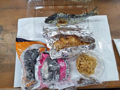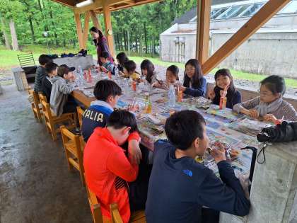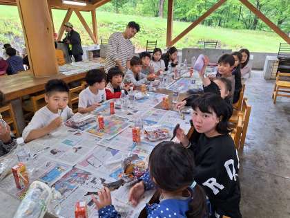 雨天のため、ますのつかみ取りもできず、ますは宿舎で焼いたものを、お昼のお弁当と一緒に食べました。まるごとの魚をそのまま食べるのは、初めての子が多く、「どこからたべようかな」とますをしみじみ観察しながら食べていました。雨天プログラムになりましたが、皆元気に楽しく過ごしています。