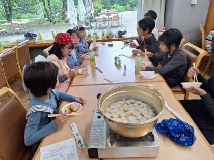 2時間半のこんにゃく作りにを経て、ようやく手作りこんにゃくが完成しました。食感も柔らかく滑らかなこんにゃくが出来上がり、子供たちも満足そうです。味噌だれを付けておいしくいただきました。