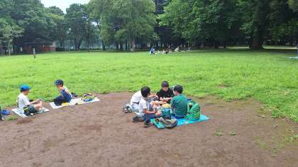 午前中、最後の見学は「馬事公苑」です。馬と人間が親しくなることをコンセプトに、緑豊かな広場となっています。馬が走っている様子を見ることができ、子どもたちも大歓声を上げていました。お楽しみの昼食は、砧公園で食べました。大きな木の下で友達と楽しく食べました。
