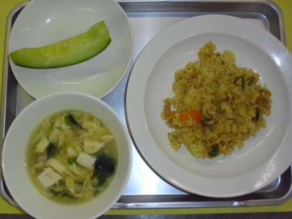 献立名 カレーピラフ 牛乳 卵とわかめのスープ メロン