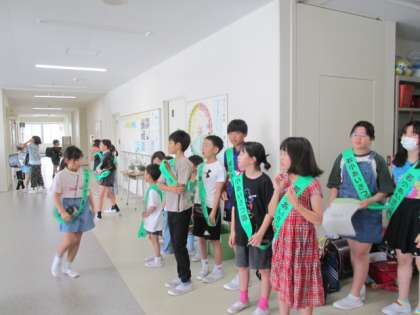 今週、4班の子どもたちがあいさつ運動に取り組みました。たすきをかけて元気よく登校してくる友達に、朝の挨拶をしていました。今回から「あいさつ隊」も登場し、校舎内に立って挨拶を呼び掛けています。子どもたち発案でいろいろな取組が生まれています。挨拶の輪がさらに広がっていくとよいです。