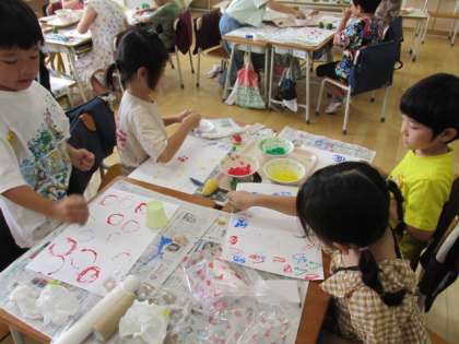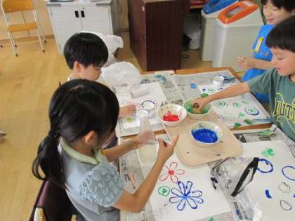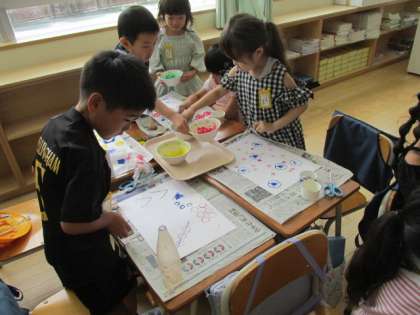 野菜の切り口や紙コップに絵の具を付けて、スタンプのように画用紙に押して模様を作りました。色や切り口の選択を自分でして、すてきな形に仕上がりました。友達の作品も見ながら、工夫したところを伝え合っていました。