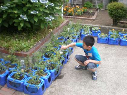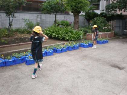 特に1年生と2年生は、植木鉢に朝顔をトマトを栽培しているので、