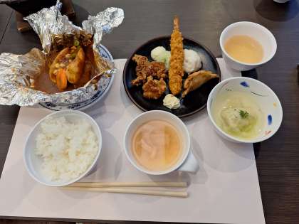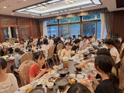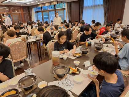 お待ちかねの夕食です。ハンバーグ、エビフライ、唐揚げと子どもたちに人気のメニューが勢揃いでした。食後のデザートは、アイスクリーム。おいしくいただきました。