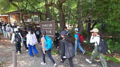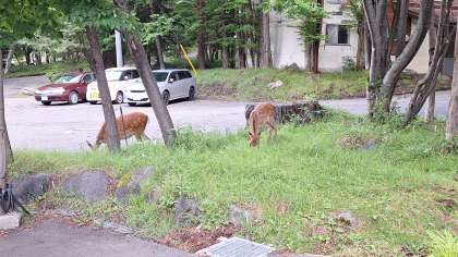 宿舎前で、鹿の親子を見ることができました。これから、ハイキングに出発です。自然の中でどんな発見があるのか、楽しみです。