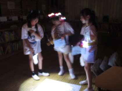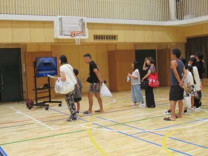 体育館で注意事項とルートについてのビデオを見てから出発です。部屋に行きつき、クイズの問題を探しあてるのも一苦労です。協力し合うほほえましい姿もたくさん見られました。最後のチェックポイントは月下のプールです。わずかに涼しくなった風を感じながら、楽しいひと時を終えました。