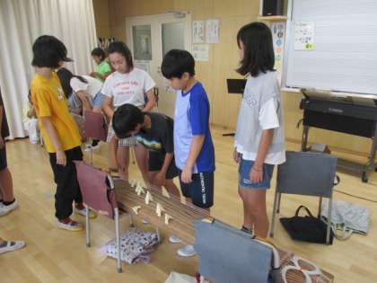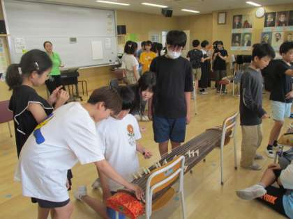 6年生は音楽で琴の学習に取り組んでいます。琴の扱い方や弾き方をビデオで学習し、グループで琴を弾き合いながら、正しい演奏の仕方を身に付けました。今後は、「さくらさくら」が演奏できるように練習していきます。伝統楽器に触れながら、琴の美しい音色に耳を傾けていました。