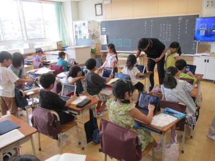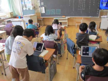 1年生にもタブレットが貸与され、これから様々な場面でタブレットを活用していきます。写真の撮り方も覚え、子どもたち自らタブレットにある機能を色々試しています。