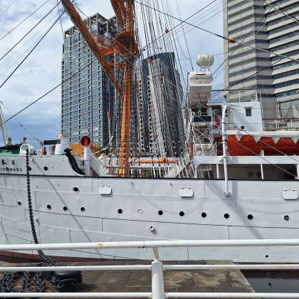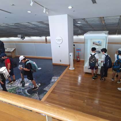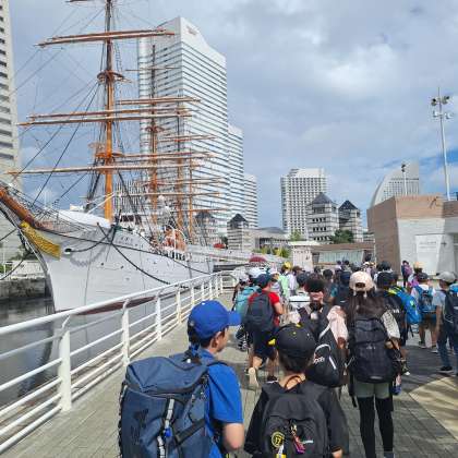 次の見学先は、横浜みなと博物館。展示物を見ながら、横浜港の歴史や仕組み、役割について学びました。目の前には、日本丸の帆船があり、内部を興味深く見学していました。