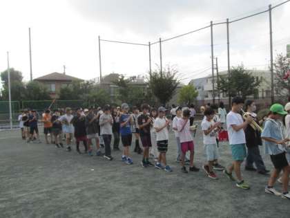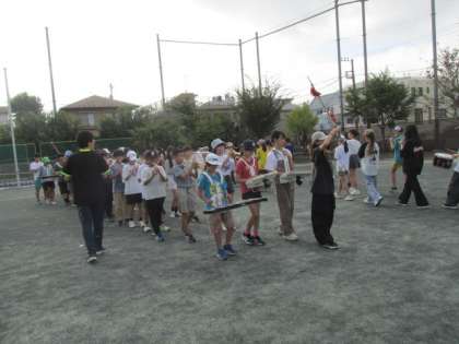 今週の全校朝会では、今後、地域行事で歩きながらの演奏があるので、実際に校庭を回りながら演奏してみました。思っていたより難しいようで、指揮と音を合わせるのがこれからの課題です。これまでたくさんの練習を重ね、どの子も自信をもって自分の楽器を演奏しています。地域でのお披露目が楽しみです。