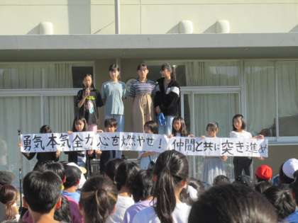 来る11月9日(土)に開催される運動会のスローガンが、発表されました。今年のスローガンは、「勇気・本気・全力 心を燃やせ 仲間と共に突き進め」です。各クラスで案を考え、代表委員会で言葉を決定しました。今日から運動会特別時間割が始まります。スローガンのように、勇気・本気・全力で練習も頑張っていきます!
