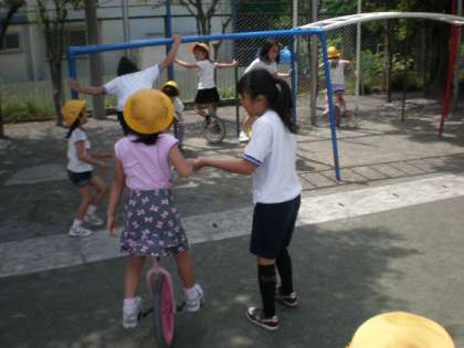 1年生と6年生は相変わらず仲良しで、一緒に一輪車をしていました。