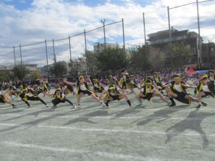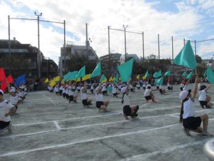 午後の部は4,5,6年生の競技・演技でした。4年生は、4色のフラッグを巧みに動かし、隊形移動も見事でした。5,6年生は、お馴染みのソーラン節。迫力と気合が感じられるソーラン節に、観客からも感嘆の声が聞かれました。また、6年生のみで一人技にも挑戦し、気持ちと動きを合わせて集団演技を披露しました。