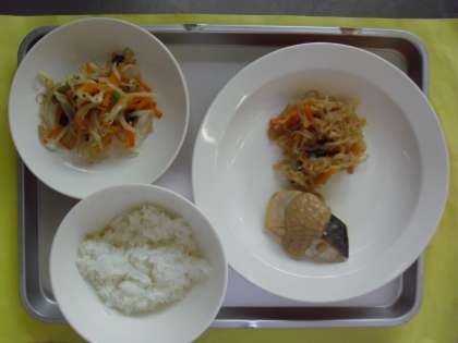 主な食材の産地 米(北海道)さば(ノルウェー)にんじん(千葉)油揚げ(カナダ)干ししいたけ(鹿児島)しらたき(群馬)さやいんげん(千葉)もやし(群馬)こまつな(長崎)
