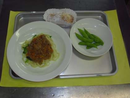 献立名 ジャージャー麺 牛乳 枝豆 カボチャのケーキ