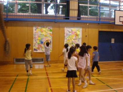七夕集会では、体育館に七夕飾りが張り出されました。